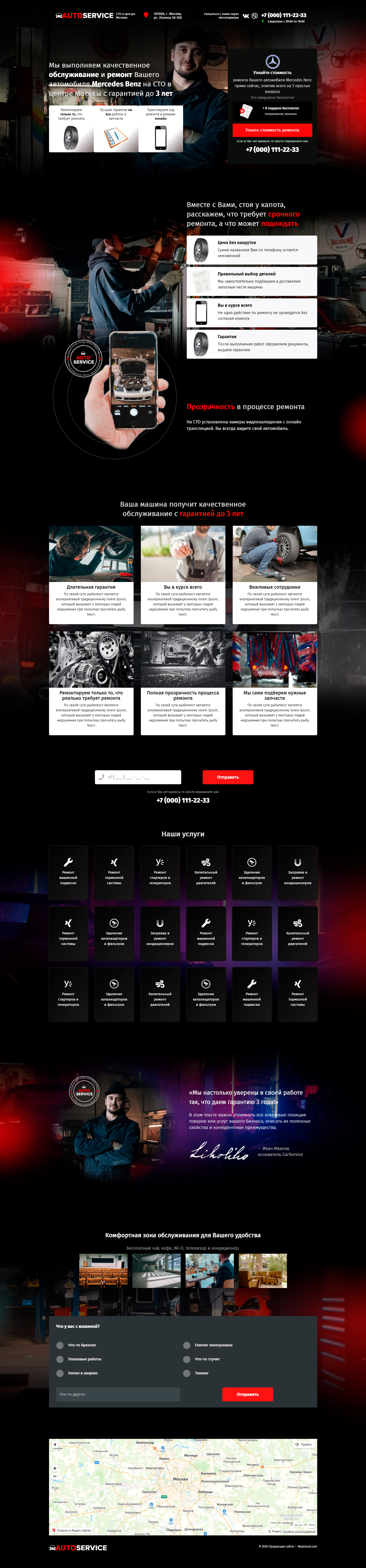 - Промоблок "Мы выполняем качественное обслуживание и ремонт" с кнопкой призыва к действию "Узнать стоимость ремонта"